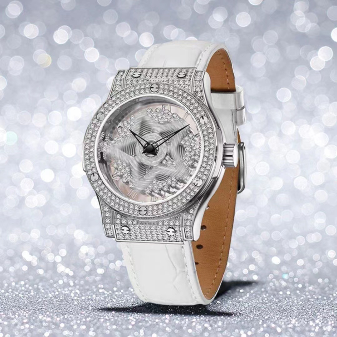 လွန်ခဲ့သော ၄ မိနစ်အမျိုးသမီး Diamond Quartz နာရီ Pentagram Full Diamond 360 Degree Rotating Ladies Watch