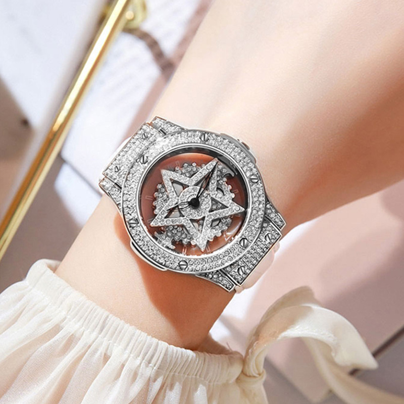 နာရီဝက်စောပြီးအမျိုးသမီး Diamond Quartz နာရီ Pentagram Full Diamond 360 Degree Rotating Ladies Watch
