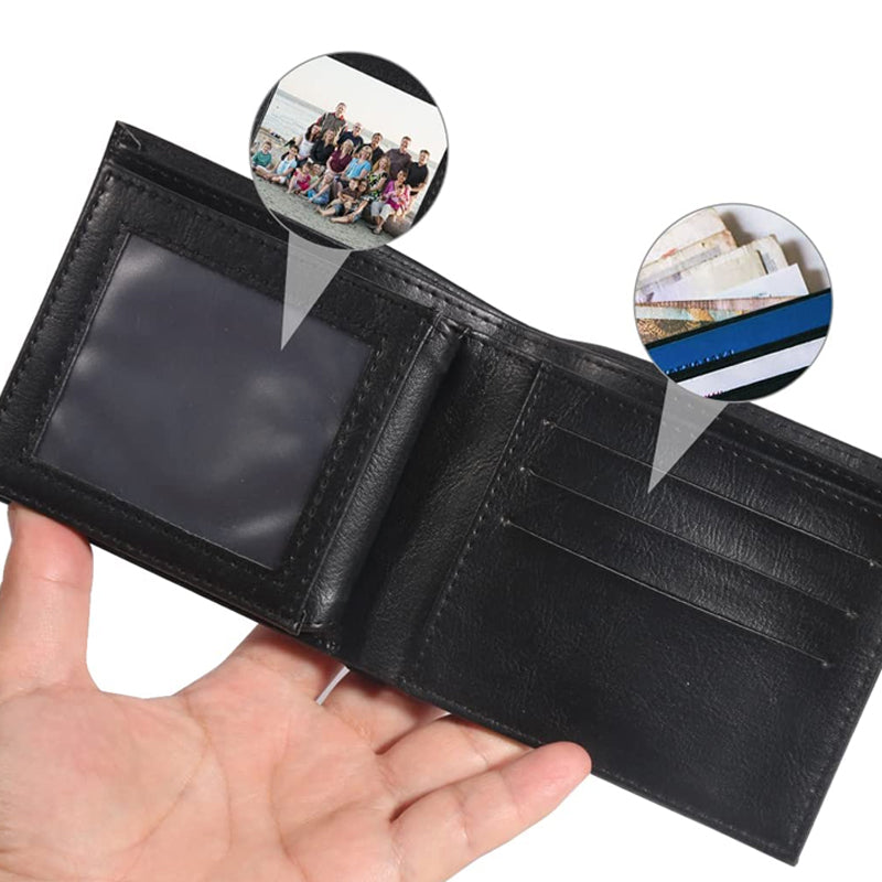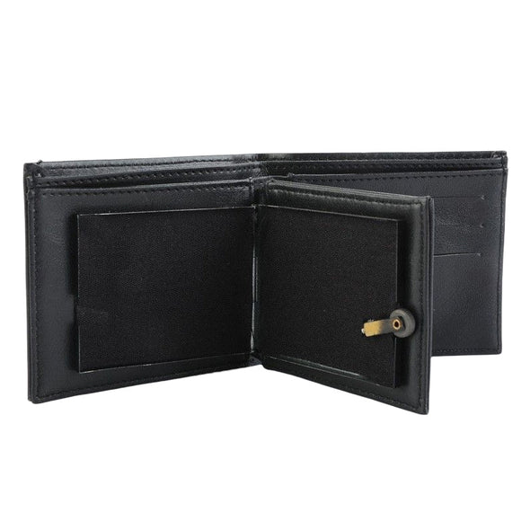 ခရက်ဒစ်ကတ်နှင့် ဘေလ်အပေါက်များနှင့် ဓာတ်ပုံရှင်းလင်းသည့် ဝင်းဒိုးငယ်ပါရှိသော ပုံမှန်နှစ်ထပ်ပိုက်ဆံအိတ်။ ရိုးရာပိုက်ဆံအိတ်အဖြစ် သင်သုံးနိုင်သည်။